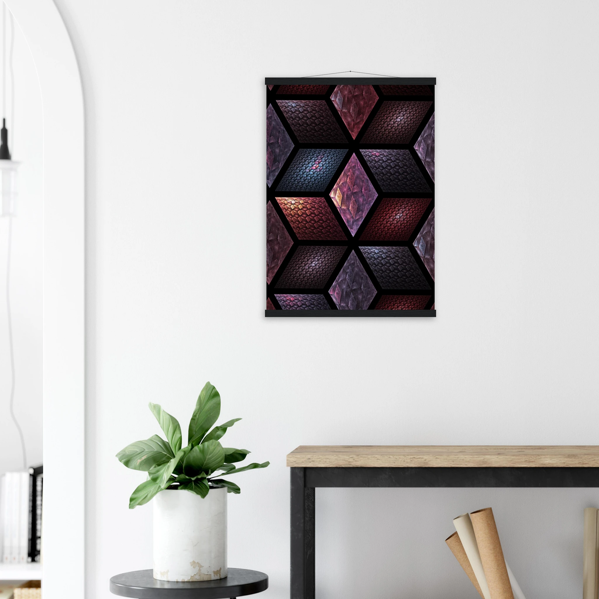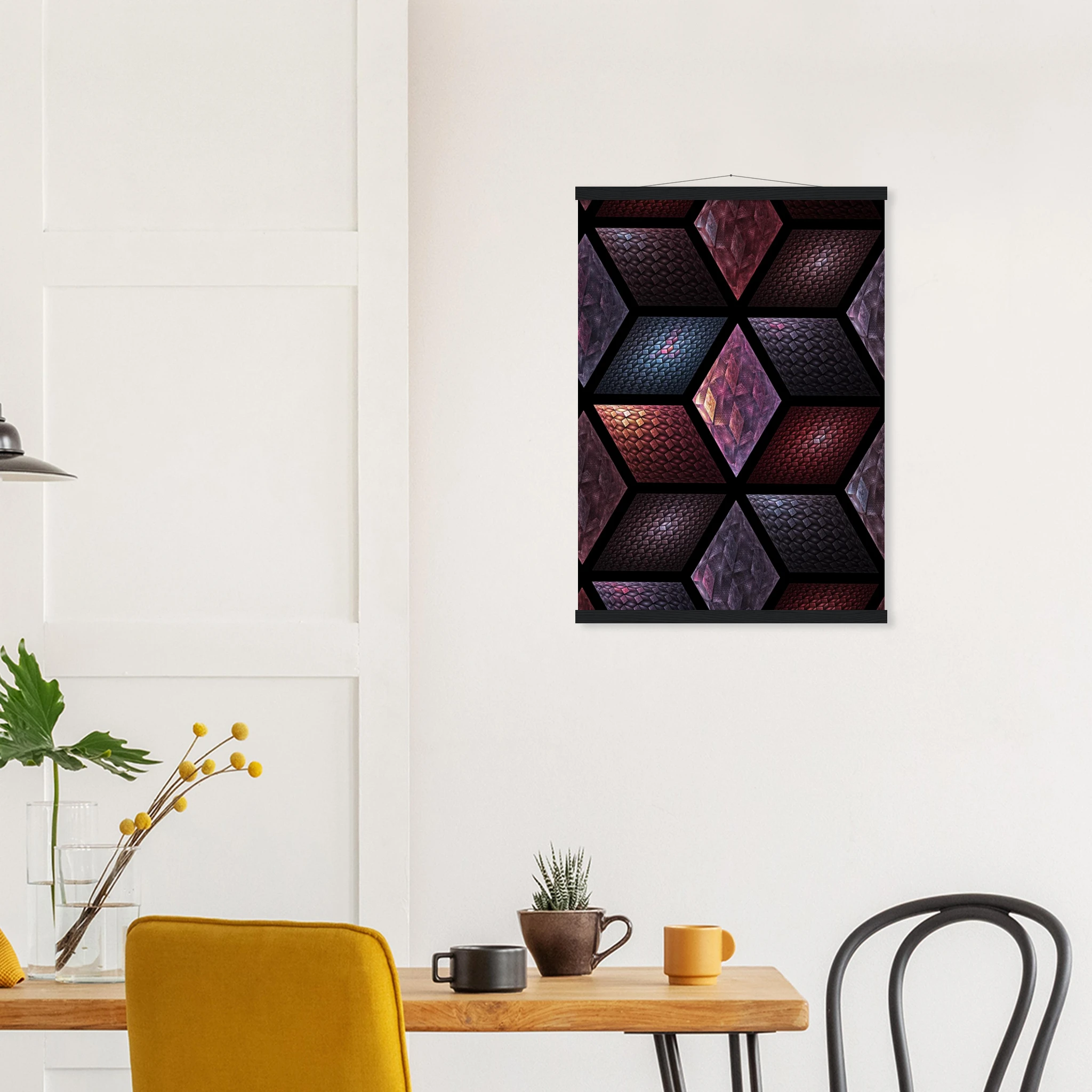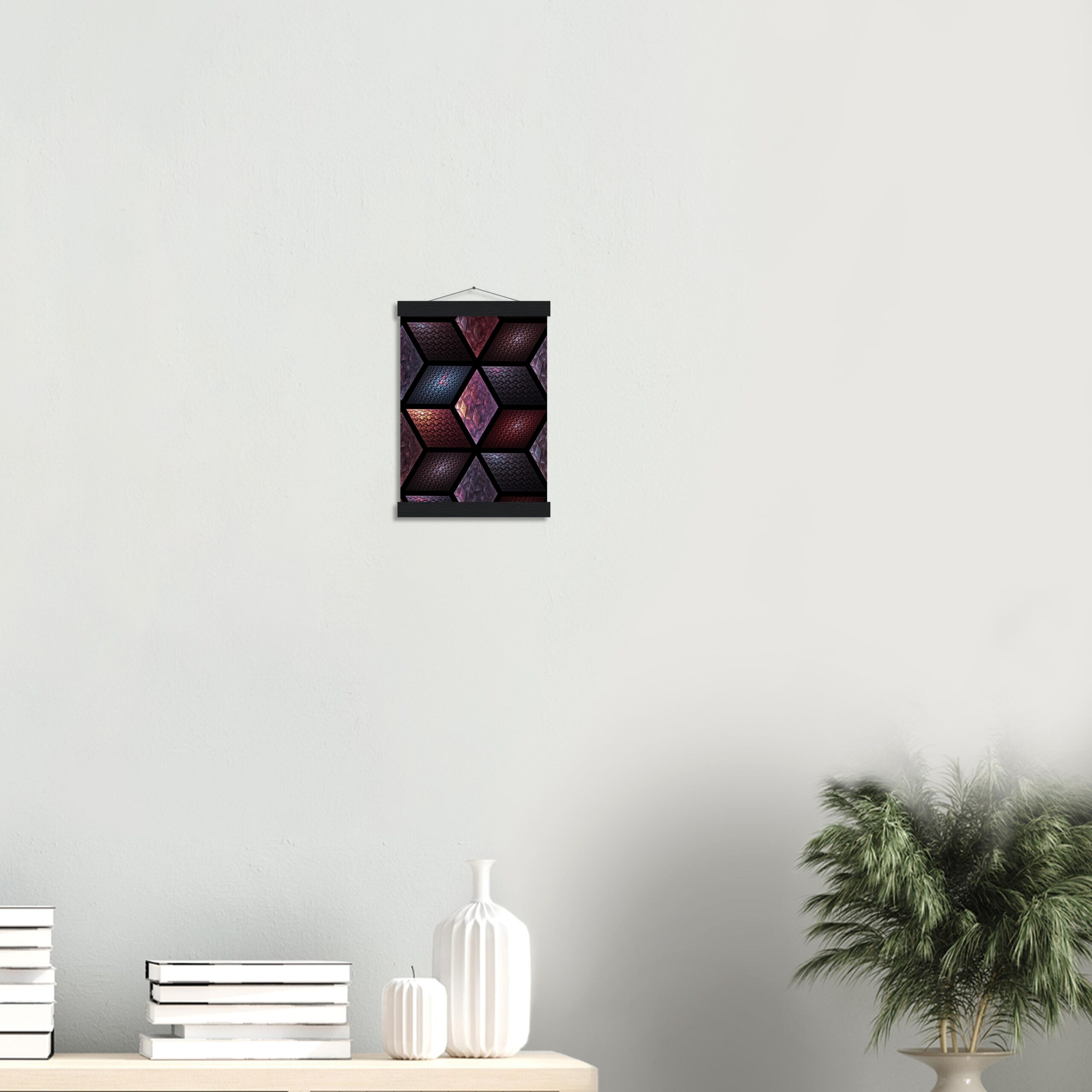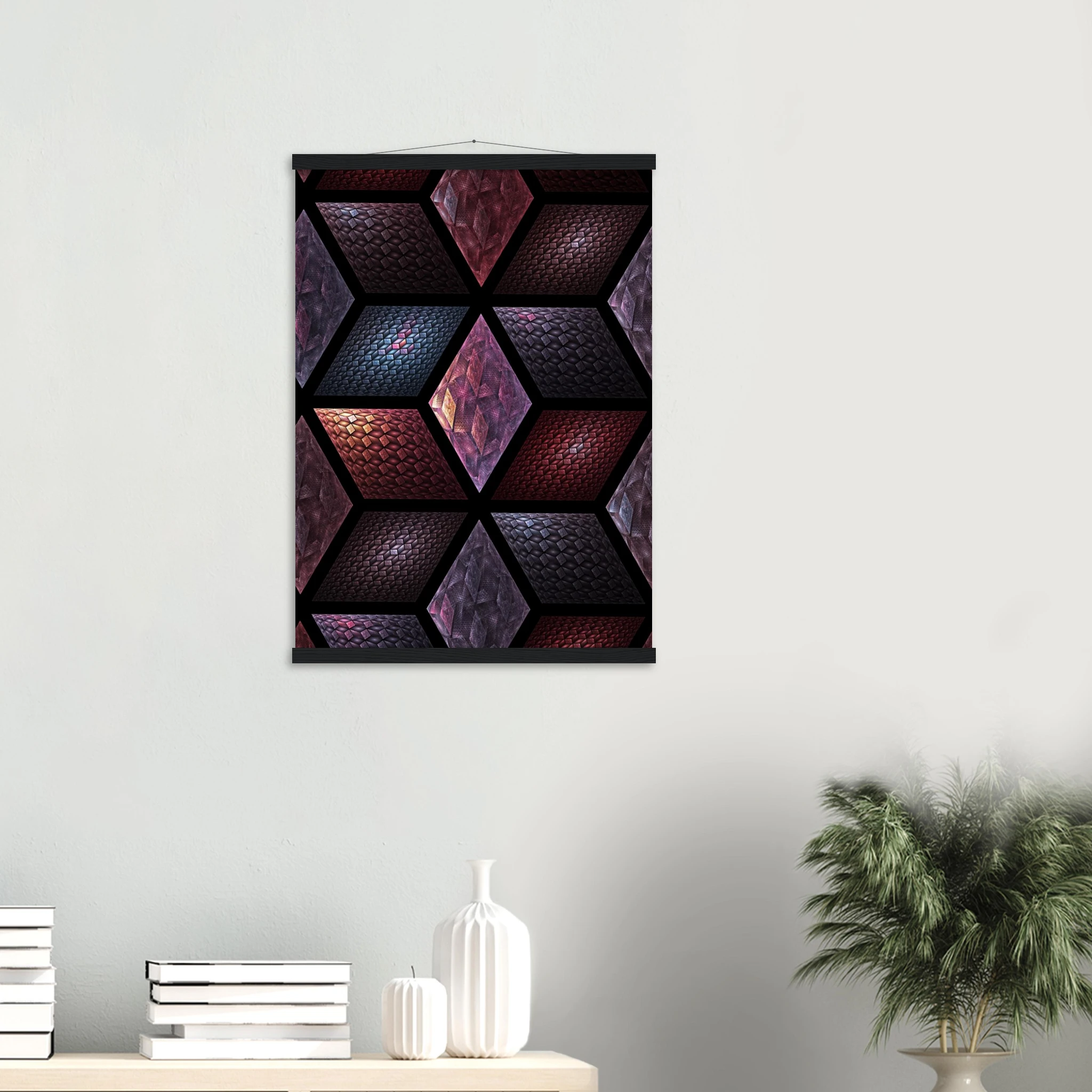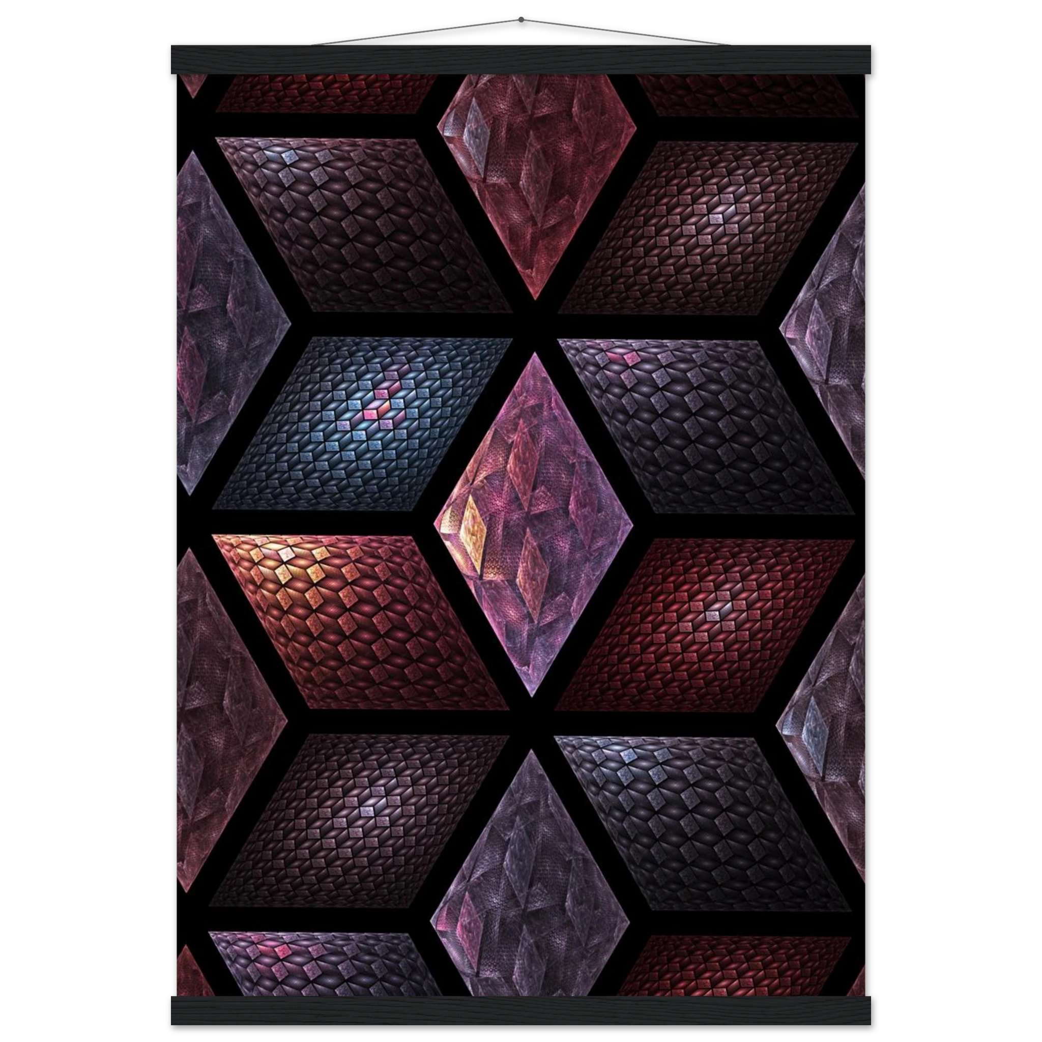 Get Cubes as an 8″ x 12″ print with a black wood magentic hanger that allows for versatile display in your home or office. This piece is produced on semi-glossy paper that enhances colors with a subtle shine.